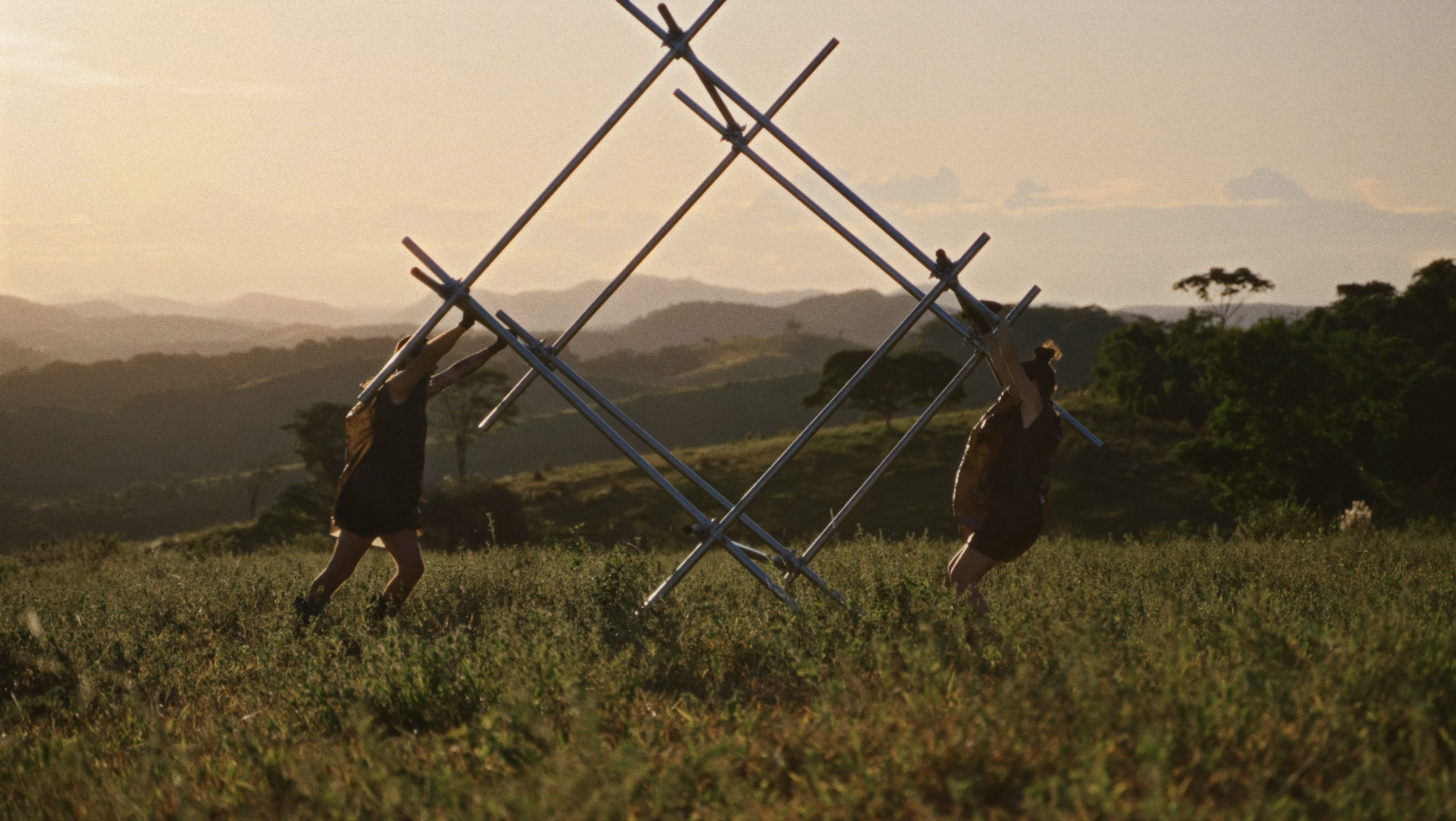 Moving Landscapes ist eine zeitbasierte Performance, die sowohl drinnen als auch draussen stattfindet. In einer Galerie, einem Veranstaltungsort, einem Museum oder einem Lagerhaus wird die Performance zusammen mit der Videoinstallation präsentiert. Im Freien wird es eine ortsspezifische Performance sein, bei der zwei Körper einen riesigen Metallwürfel in der Natur oder in einer städtischen Umgebung in der Nähe des jeweiligen Veranstaltungsortes bewegen. Diese physische Struktur ist bewusst einfach gehalten. Es handelt sich um einen leeren Körper, einen dreidimensionalen Würfel aus Metallrohren mit den Maßen 3m x 3m. In seiner grundlegenden konstruktivistischen Einfachheit repräsentiert diese Trägerstruktur die porösen Grenzen zwischen innen und aussen, privat und öffentlich. Es ist ein mehrdeutiges Skelett, das die Leere aufrechterhält, in der wir uns bewegen können, sowohl innerhalb als auch aussen, um sie herum. Unser Interesse am Würfel als performativem Werkzeug entfaltet sich entlang zweier komplementärer Linien, die mit dessen inhärenten Paradoxon umgehen: der konkreten Materialität seiner skelettartigen Konstruktion und der immateriellen Leere, die nur die poröse Realität eines internen/externen Raums suggeriert. Die materielle Konstruktion des Würfels interessiert uns sowohl im Hinblick auf die Arbeit (Konstruktion als Verb) als auch auf die physische Präsenz (Konstruktion als Substantiv). Indem wir den Würfel als kontinuierliche Arbeit behandeln - beim Herstellen, Transportieren und Bewohnen - setzen wir das performativ-prozedurale Verfahren fort, das wir zuvor in Bezug auf das Seil entwickelt haben. Die Materialität des Würfels, die sich durch die Aktivität der Körper, die damit interagieren, laufend auflöst, erzeugt gemeinsame Choreografien des Verhaltens und der Zusammenarbeit, die den Raum-Zeit-Kontext der Performance beeinflussen und formen.