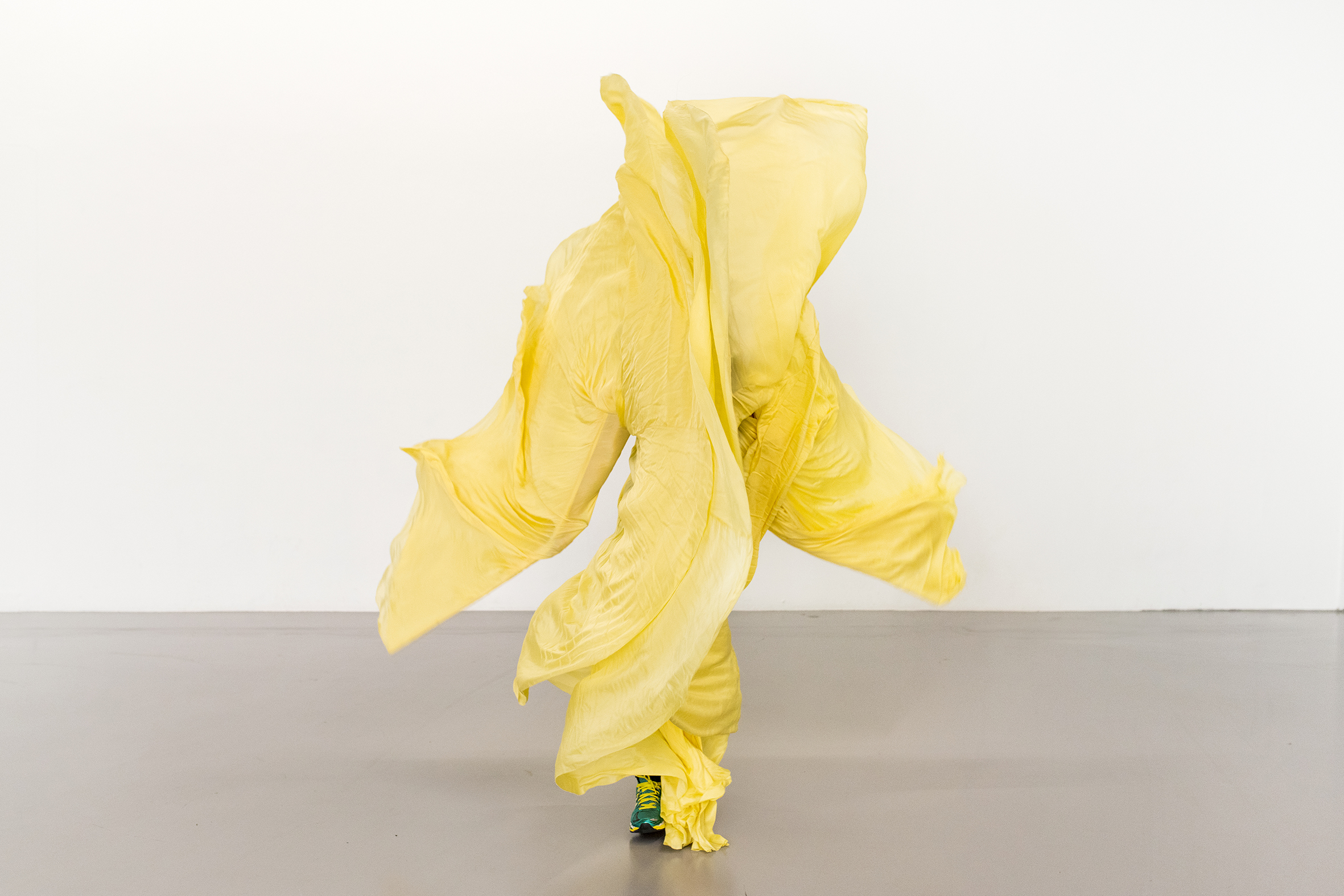 This performance is examining the limits of human agency and the agency of an object in action. LOIE FULLER: Research consists of two exercises. Inspired by the relation between the sculptor (human) and the sculpture (non– human), the workout deals with material agency of the human body and the agency of the artefact (‘Dancing Dress’) in their continuous relation similar to the act of sculpting. It’s a physical practice stimulating the movement of matter receiving form, a movement that emerges as a result of the relationship between the human body and the object (‘Dancing Dress’). The idea of the exercise does not aim at strengthening the impulse to live a physical relationship with things; instead it focuses on facilitating forms that make that relationship visible.
