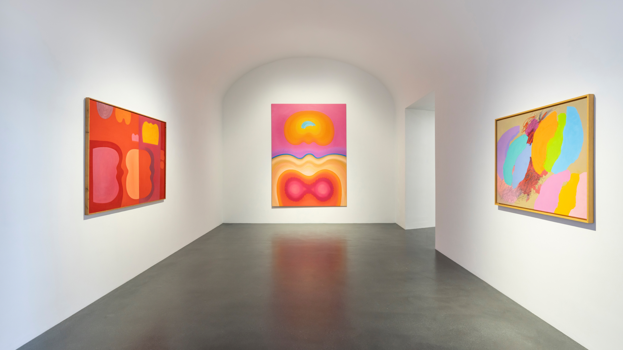 Colour has traditionally played a pivotal role in Keserü’s practice. Indeed, the artist’s use of bright, vibrant hues has been underpinned by her studies on the relationship between the colours of human skin and the colours of the rainbow. She has also elaborated on other aspects of rainbow colours, sometimes combining them with linguistic elements; or referring to the presence of participants. In 1987, Keserü’s interest in the “Möbius strip” allowed her to connect an infinite sequence of colours with spatial forms. Another turning point in her decades-long colour research came in 2001, when, following her second residency in Rome, she found herself drawn to the Renaissance technique of cangiante, which she drew upon for her transposition of musical sound into visual forms.
